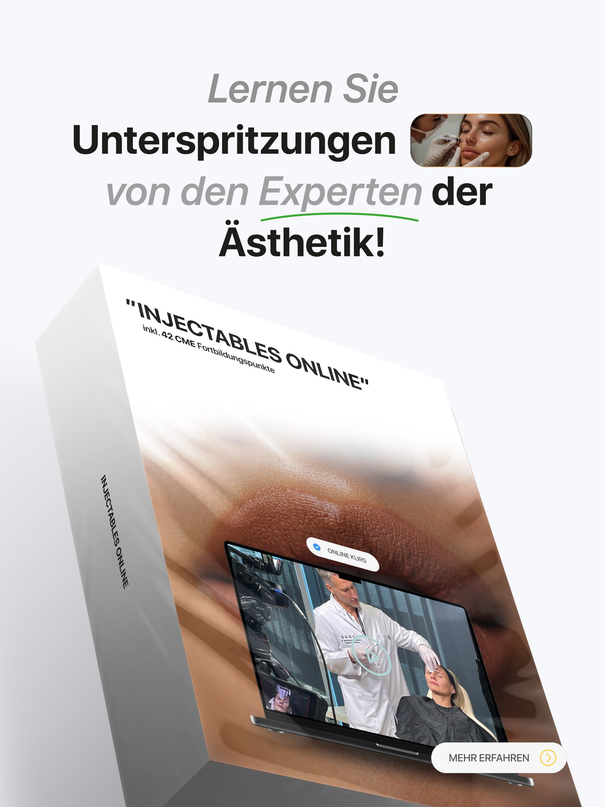Der Kurs "Injectables Online" ist ideal, um von den führenden Experten der Branche alles Wissenswerte über Botolinum und Filler zu lernen. Nach Abschluss des Kurses sind Sie optimal vorbereitet, um direkt in die Praxis einzusteigen.