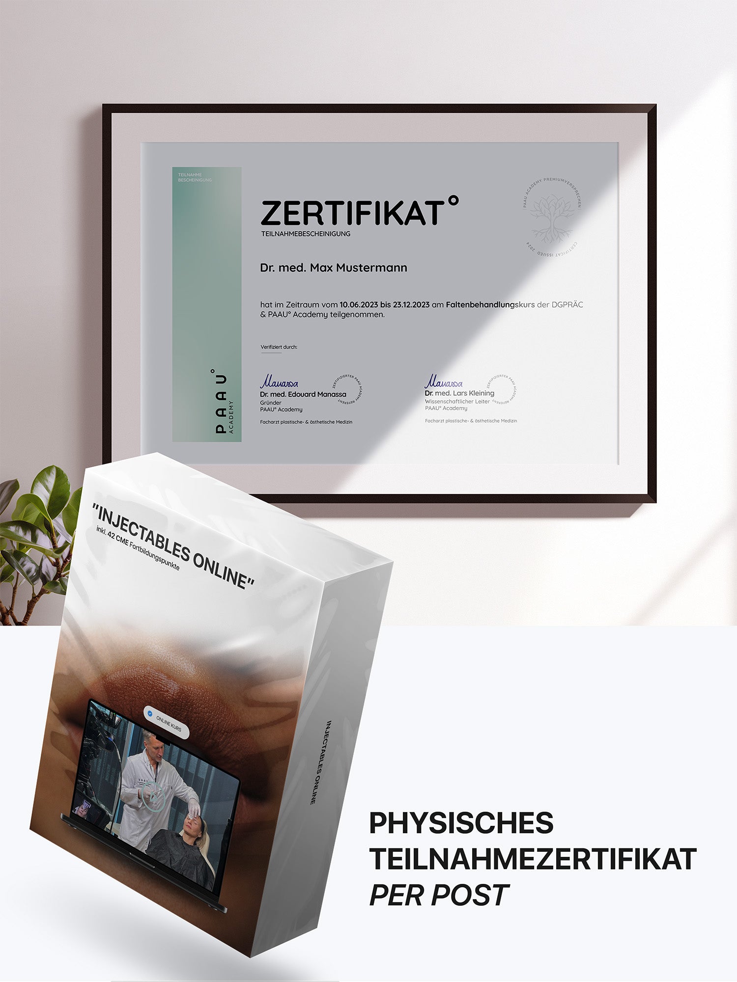 Ja. Sie erhalten downloadbare Arbeitsmaterialien: Behandlungspläne, Dokumentationsvorlagen, Vorher-Nachher-Foto-Anleitungen und eine umfassende Ästhetik-Checkliste.